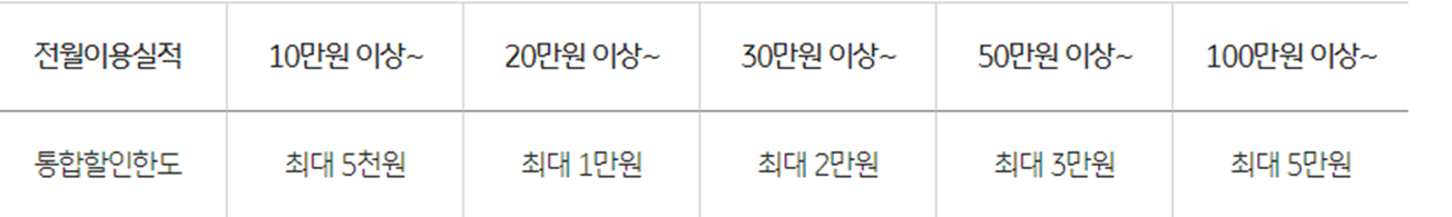 | 통합 월 1회, 연 4회, 건당 이용 금액 2만원 이상 시 할인 | 건당 이용금액 2만원 이상 시 건당 최대 이용금액 5만원까지 할인 적용 |