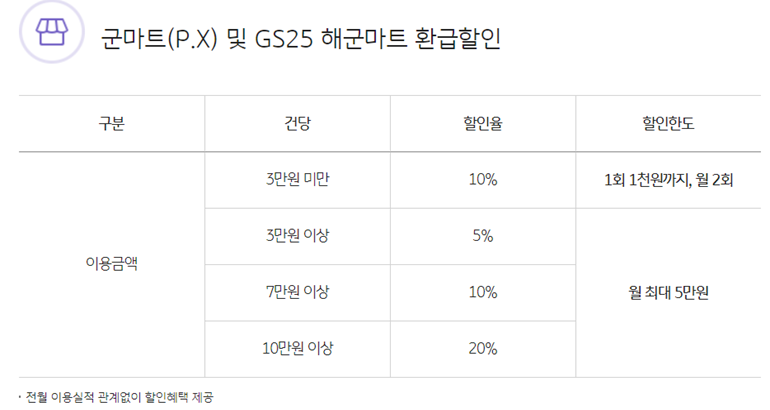 통합 할인한도 : 제한없음 전월 이용실적 : 8만원 이상 군마트(PX), CU, GS25(해군마트 포함) 모든 품목 10% 청구할인(통합 월 2회, 월 최대 2천원). 건당 이용금액 1만원 한도(건당 최대 1천원 할인) CU