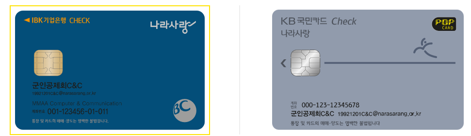 나라 사랑 체크 카드는 IBK 기업 은행 카드와 KB 국민카드 두종류가 있습니다.